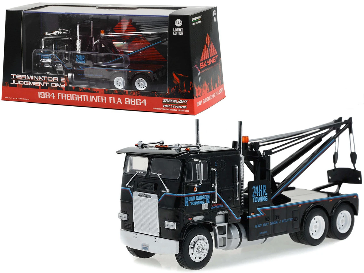 - Brand new 1/43 scale diecast car model of 1984 Freightliner FLA 9664 Tow Truck Black “Road Ranger Towing” “Terminator 2: Judgment Day” (1991) Movie die cast model car by Greenlight.