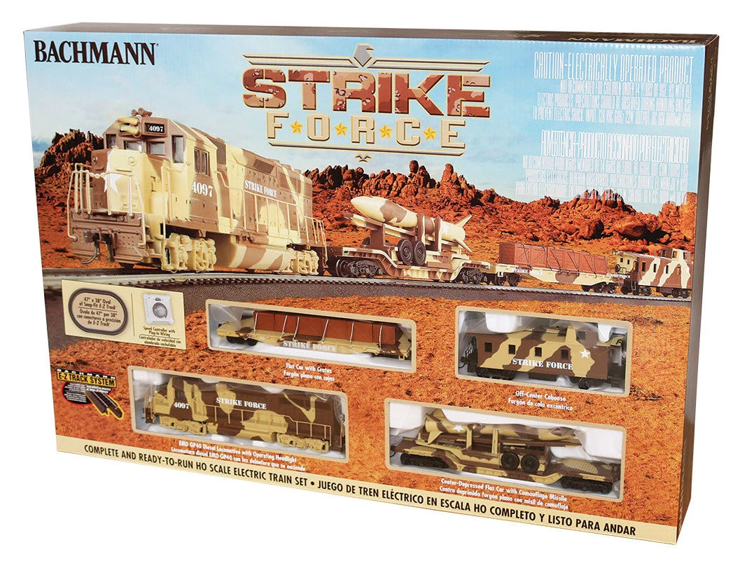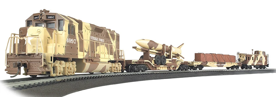 Rail transport has played a crucial role in successful U.S. military campaigns since the Civil War. Often serving as the logistical backbone of large operations, military trains deliver personnel, weapons, ammunition, and food to the troops in the field. With our Strike Force Ready-to-run train set, we honor the tireless efforts of our men and women in uniform.