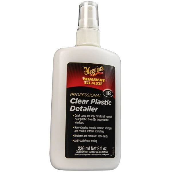 Clear Plastic Detailer® is a quick spray and wipe product for all types of clear plastics from CD’s to convertible windows. Non-abrasive formula removes smudges and residue without scratching. Restores and maintains optic clarity. Anti-static/non-crazing formula. 8 oz. spray bottle