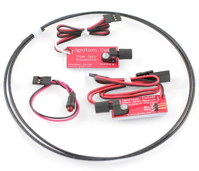 The Smart-Fly single-receiver Ignition Cutoff is designed for planes utilizing a single receiver for the flight system. The Ignition Cutoff provides safety and convenience for your gas powered plane. The unit has two modules that are connected by a fiber-optic cable. This isolates your radio system from your ignition system both electrically and physically. The physical separation prevents any inducted noise from getting into your receiver as many of the single unit ignition kills can. The unit works off a toggle switch on your transmitter and requires a separate channel to operate it. The LED on the ignition side is removable and extendable with standard extensions. The LED is not required for the unit to operate properly. This unit is designed only for electronic ignitions and will not work with magneto ignitions.