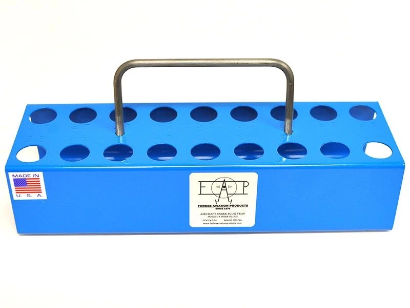 Sturdy steel spark plug tray holds up to 18 aviation spark plugs. Speeds handling of used or new plugs. Holes numbered to correspond with engine cylinders. Protects against shielding barrel contamination. Rubber, non-slip pads.