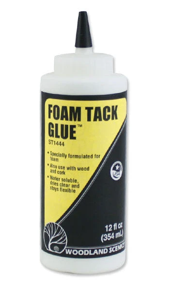 Perfect for securing Risers and Inclines from the Subterrain System, this adhesive works well on most materials, such as foam, cork, Homasote and wood. It’s specially formulated to dry completely when applied between foam sections, unlike most common white glues. Great for gluing large sheets, or thin and narrow pieces, simply apply a bead and press together. By applying a bit of Foam Tack Glue to both surfaces and allowing them to dry for a few minutes, it can be used as a contact cement.